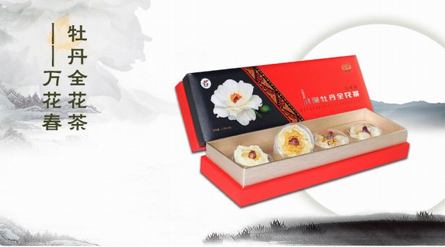 牡丹全花茶花朵原料全部采用当天初开的鲜嫩牡丹花朵,工艺采用公司自主知识产权等创新工艺,经多次清洗花瓣表面的粉尘和花粉,并经260-280度高温杀青5-10分钟,有效解决了涩口和花粉过敏的技术问题,该全花茶属于熟制花茶,有效去除了牡丹花生青的气味,口感清香淡雅、回味微甜,与同类产品比较,茶汤透彻清灵,口感清雅。
