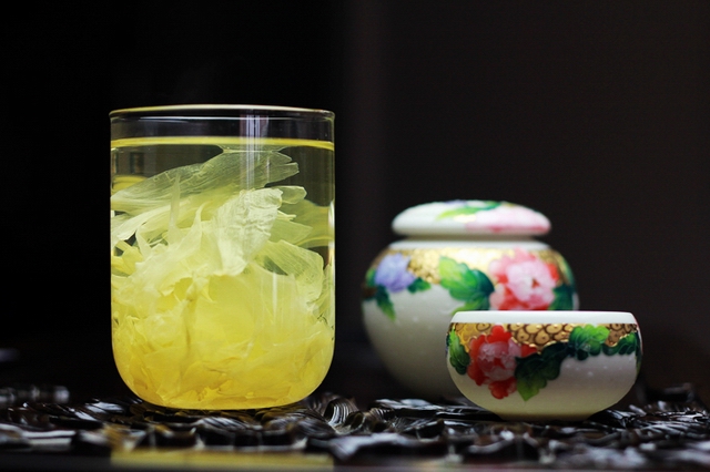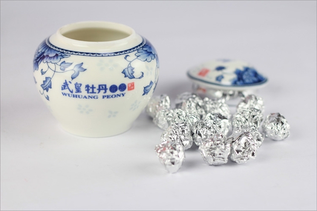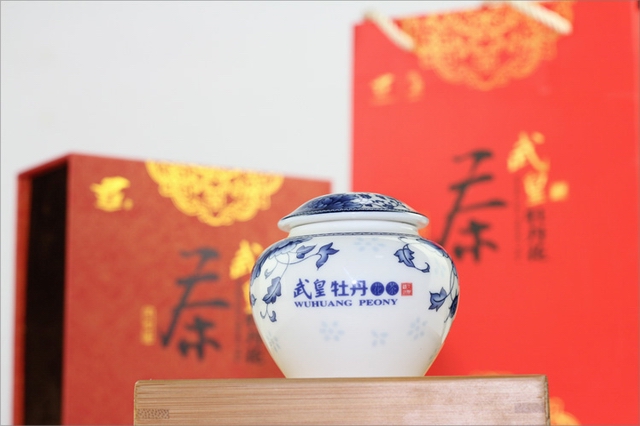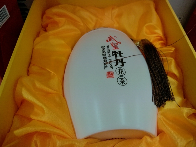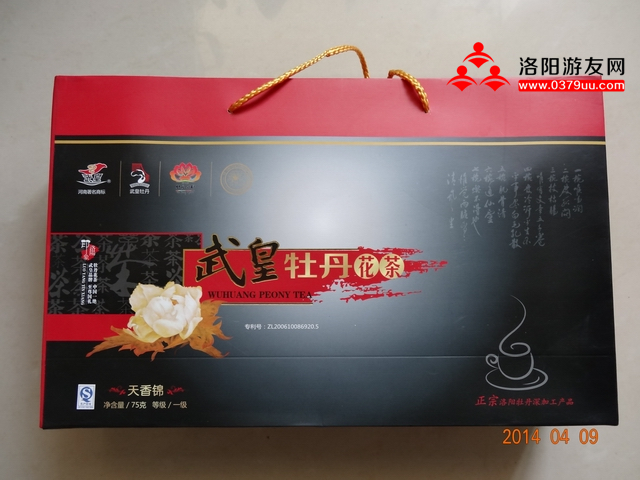 “武皇”牌牡丹花茶是洛阳祥和牡丹科技有限公司于2006年创始研发的一款高端花茶,是我国获得国家发明专利的牡丹深加工产品。该茶原料采用食用与药用丹凤牡丹鲜嫩花瓣,经过清洗、剥膜、脱脂、保鲜、提香、干燥等16道工艺程序,制成条索状茶丝。经85度开水冲泡后5秒钟,纯牡丹花瓣茶在茶杯中舞动着绽放出一片片柔美的牡丹花瓣,动感迷人,茶汤清澈,茶香淡雅、入口爽润,令人心旷神怡。