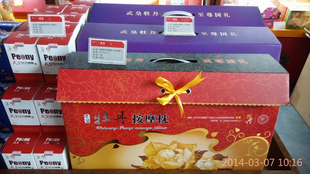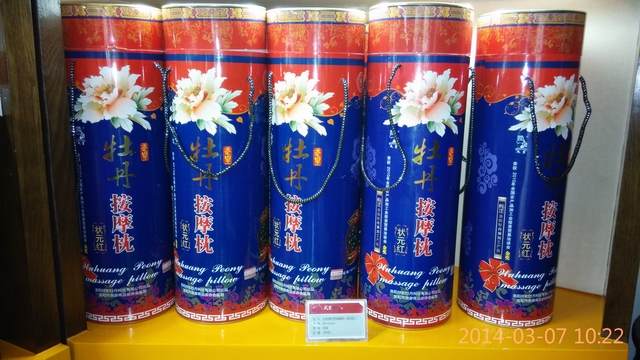 牡丹按摩枕是祥和牡丹科技公司融合古代典籍和现代医学及名家理疗、药疗按摩手法,根据人体生理曲线和现代的床垫科学设计。2010年获得国家发明专利。该枕枕芯填充物选用牡丹花籽、丹皮、玉石、中医花草和球状珍珠棉。经特殊工艺处理的牡丹花籽表面坚硬、圆润光滑,使用时牡丹花籽可对颈部穴位起到点式刺激、按压作用;球状珍珠棉具有蓬松、柔软、富有弹性的舒适效果。