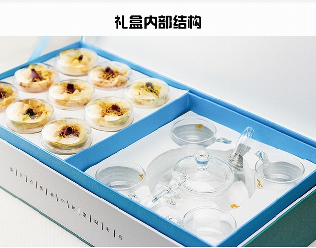 牡丹全花茶高端产品--《洛阳锦》 698元/盒 内含1.5g牡丹全花27朵,内附玻璃茶具一套(一壶四杯,300ml)