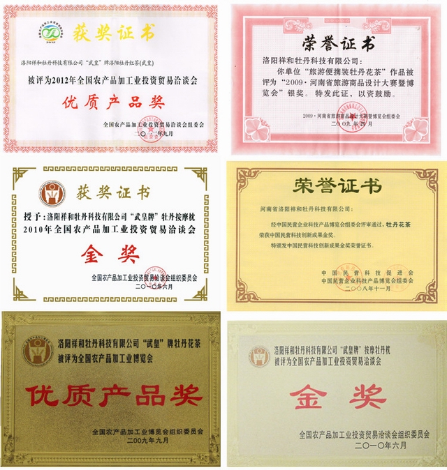 公司自2009年以来连续获得洛阳市ZF授予的“农业产业化重点龙头企业”,2012年获得市级“牡丹花食用与药用工程技术研究中心”,2013年,获得国家科技部“洛阳牡丹深加工产业化技术示范”星火计划项目;同年,公司申报的国家“丹凤牡丹花新食品原料”项目获得国家卫计委批准。公司还为牡丹花茶制定并申报了河南省地方标准。